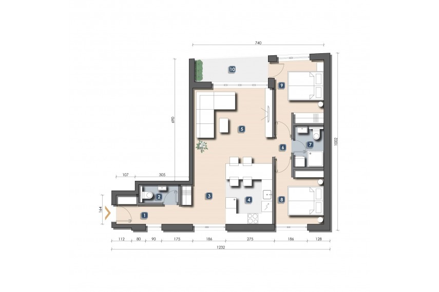 Trosoban stan, 76,36m2, orijentisan prema Gostivarskoj (severoistočno) i prema atriumu, panoramski pogled. Odlično organizovn i funkcionalan. Sastoji se od ulaznog hodnika, toaleta, dnevnog boravka povezanog sa kuhinjom i trpezarijom, dve spavaće sobe, kupatila i terase.